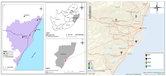 The study areas were: the Isipingo Wastewater Treatment Works (29°59′24.936″ S 30°54′21.78″ E), Southern Wastewater Treatment Works (29°55′51.456″ S 30°59′53.268″ E), Northern Wastewater Treatment Works (29°48′49.356″ S 30°52′23.7″ E), and New Germany Wastewater Treatment Works which is known as an innovative water treatment (29°47′43.44″ S 30°59′53.268″ E). The global positioning system (GPS) was used to supply accurate sampling position sites. The map of the sampling locations is presented in Figure 2. These treatment wastewater works are located across the Durban and UmLazi catchment areas under the eThekwini Metropolitan Municipality, KwaZulu-Natal, South Africa. The Southern Wastewater Treatment Works (SWWTW) is located at Wentworth Valley, Bluff and receives the majority of its raw sewage effluent through three large (1500 mm diameter) trunk sewers, i.e., Main Southern (“Jacobs”), Wentworth Valley, and UmLaas Trunk Sewers. Other smaller diameter pipelines coming to the plant include those from Mondi, SAPREF, and Illovo. The total average daily flow to this plant is ±130 mL/day. The UmLaas Trunk Sewer, serving Chatsworth and UmLazi, is predominantly domestic in origin with a discharge flow of ±35 mL/day. This plant discharges all its treated flows directly to the sea through a 4.2 km long, 1500 mm diameter sea outfall [36]. The Isipingo Wastewater Treatment Works (WWTWs) is located in the lower catchment Malukazi Malagazi UmLazi. The facility was built in the late 1960s, collects its raw sewage from the domestic communities within its catchment, and discharges an average of 10.98 mL/day of treated effluent into the Isipingo River [37]. The Northern Wastewater Treatment Plant (NWWTP) is located at 199 Johanna Rd, Peter Road, east Durban, with about 35 industries. The plant receives a capacity of about 60,000 L/day with a monthly capacity of 18.27 mL/month [38] and discharges its treated effluent into the uMgeni River. The New Germany Wastewater Treatment Works (NGWWT) is located at Unit 2 Devon Centre, Durban, 15 Devon Rd, Germany.
