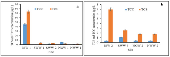 Due to their frequent usage, the environmental implication to aquatic life, and the health-associated effects of TCS and TCC on humans, it is crucial to evaluate the levels of TCS and TCC from raw sewage and effluent that finally end up in surface water. Four selected WWTPs across the Durban metropolis were sampled in this study. These WWTPs receive their raw sewage from domestic sources and a few receive from both domestic and industrial sources. Raw wastewater and effluent were both evaluated for contaminants of concern in this study; the results are presented in Figure 3a,b respectively.
