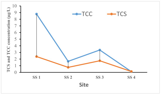 The levels of TCS and TCC found in the sludge samples collected across the selected WWTPs in this study are presented in Figure 4. The concentrations of TCS and TCC found in the sludge samples ranged from 0.136 to 2.382 µg/kg and 0.107 to 8.782 µg/kg. The concentration of TCC was significantly higher than the level of TCS across the sampled WWTPs except for the Northern wastewater treatment plant (SS 4). The observed trend here could be due to its relatively low water solubility and high logarithmic octanol/water partitioning coefficients (log Kow). These properties typically enable TCC to have substantially higher antimicrobial concentrations in wastewater sludge as compared with TCS. TCS has high water solubility (10.0 mg/L) with a pKa of 7.9 and is prone to microbial degradation, preferentially being converted into its metabolites through biotic and abiotic processes and mechanisms within organisms and WWTPs as well as in the environment [20,56,57]. Whereas only a fraction of TCC in wastewater is removed through biologically mediated transformation and as a result of its molecular nature. TCC can remain unionized in a broad range of pH values (pKa = 12.7) and displays a more limited activity as compared with TCS and [21,22], although TCC can undergo both chemical and biological transformation processes due to its trichlorinated structure, thereby, forming chlorinated anilines which are hematotoxic and carcinogenic as compared with the parent TCC [58].