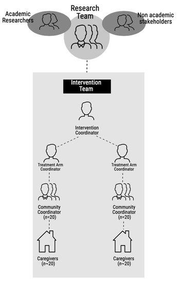 The Hygienic Family intervention worked with forty community coordinators (frontline intervention implementors) and two drama groups. Each community coordinator was responsible for a cluster of up to 25 caregivers (recipients of the intervention). Each treatment arm was supported and supervised by a treatment arm coordinator, who were in turn supported by an intervention coordinator, overseen by a dedicated research fellow and the principal investigator (Figure 1). Intervention implementation included the provision of items including paint, Glo GermTM (Moab, UT, USA), development of training manuals (printing, binding, and laminating of training manuals) and illustrations, PA systems (hired), consumables (e.g., paper plates, spoons, and fruits), and hygiene consumables, e.g., soap (Appendix A). Details of the trial design and methods are described elsewhere [15,17].