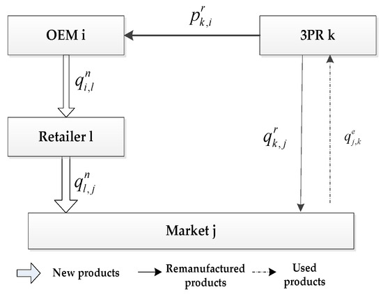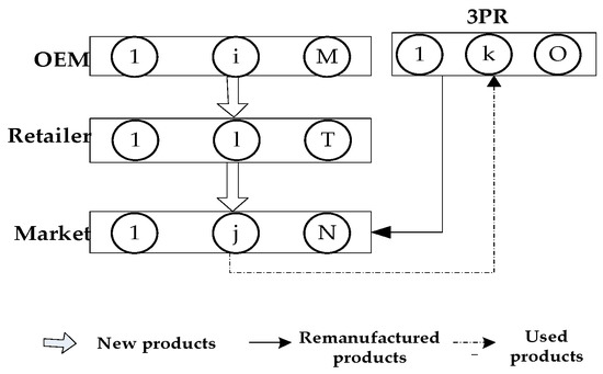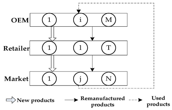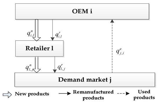 From Figure 3, during one OEMs’ production period, the transactions between OEM , retailer , and demand market are as follows: OEM produces items of new products and sells items of these new products to retailer , who will in turn sell of them to the demand market . After the new products have been resumed by the consumers in demand market , it will return items of these used products to the OEM for remanufacturing. After the used products have been remanufactured by the OEM , they will become remanufactured products. The OEM will then sell item(s) of these remanufactured products to retailer , who will in turn sell of them to the demand market . (The consumers can buy the new products or remanufactured products from the demand markets according to their green product preferences.)