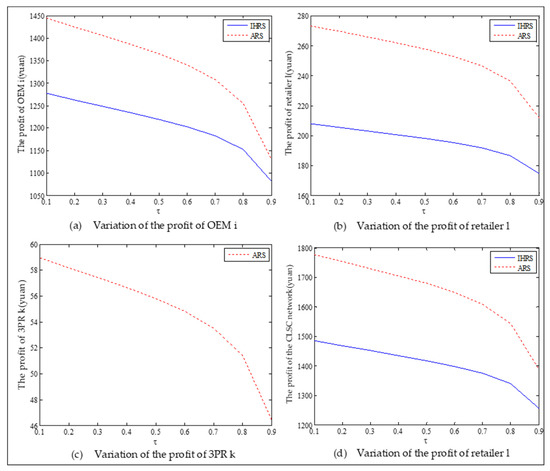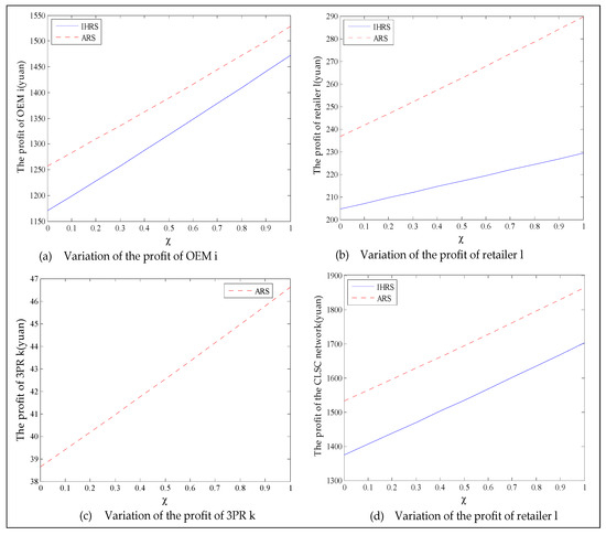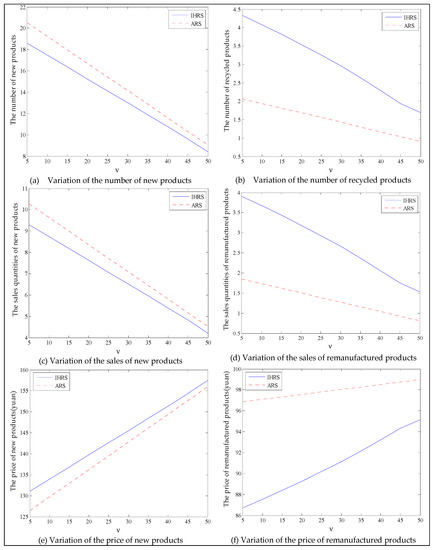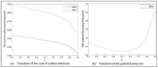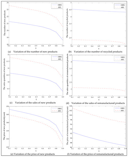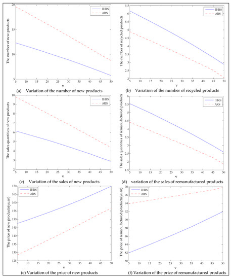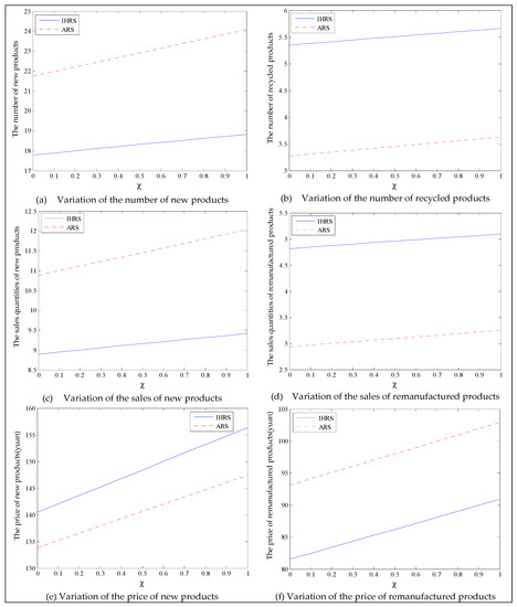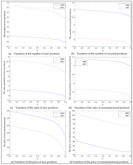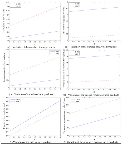 Thus, from the results of this section, the emergence of green consumers reduces the production and the prices of these two products, resulting in a slight reduction in the profits of the decision-makers. However, on the other hand, the emergence of green consumers reduces the quantity of carbon emissions. From the perspective of the OEMs’ profit, when the lower limit of the recovery rate is less than 0.6, the OEMs will choose the IHRS; when the lower limit of the recovery rate is higher than 0.6, the OEMs will choose the ARS to obtain the maximum profit. From the perspective of carbon emissions, the increase in the green consumers will greatly reduce the amount of carbon emission in the two models; when the lower limit of the recovery rate is low, the amount of carbon emission due to the ARS model is less than that due to the IHRS model, but when the lower limit of the recovery rate is higher, the situation is reversed. Therefore, although the emergence of green consumers reduces the profits of the decision-makers, it indirectly promotes green behaviors among the enterprises. While reducing the profits of the enterprise, the emergence of green consumers can effectively reduce carbon emissions and bring long-term environmental benefits, which can help the long-term development of the enterprises.