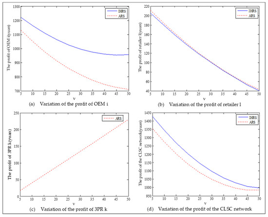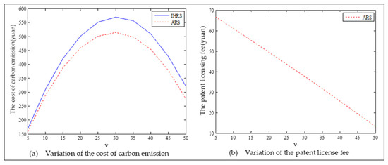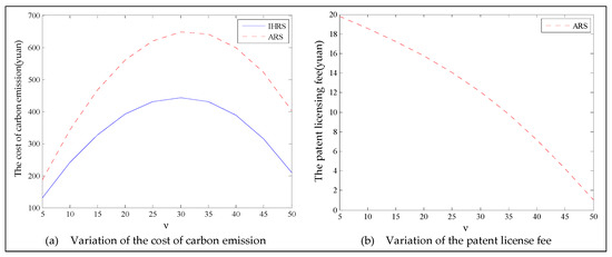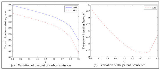 When the lower limit of the recovery rate is low, the emergence of green consumers leads to a downward trend in decision variables. We observe from Figure 19 that when the proportion of the green consumers increases, the production quantities, sales, and prices of the new products of both the IHRS model and the ARS model largely decrease; the recycling quantities and the sale quantities of the remanufactured products slightly decrease, but the sales quantity of the remanufactured products in the IHRS model is higher than that of the ARS model. The above directions of movement for the decision variables with respect to the proportion of green consumers are consistent with the statements of Proposition 5 and Proposition 11. From Figure 20, when the proportion of the green consumers increases from 0.1 to 0.9, the carbon emission costs charged to the OEMs and the 3PRs to produce these two products gradually decreases, but the carbon emission cost of the IHRS model is higher than of the ARS model. The patent licensing fees paid by the 3PRs to the OEMs first decrease and then increase, and the patent licensing fee paid by the 3PRs to the OEMs has its minimum value when . From Figure 21, when the proportion of the green consumers increases, the profits of the OEMs, the retailers, the 3PRs, and hence the entire CLSC network decrease. When the lower limit of the recycling rate is low, there are fewer products available for recycling and remanufacturing in the market, and the emergence of environmentally conscious green consumers further reduces the demand for these two products. Thus, to increase sales and obtain more profits, the OEMs and 3PRs will choose to decrease the selling price of their products. On the other hand, OEMs will consider charging 3PRs with a higher patent licensing fee to compensate the loss of profits due to the decrease in sales quantities.