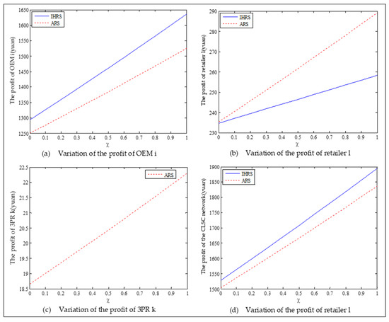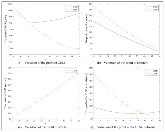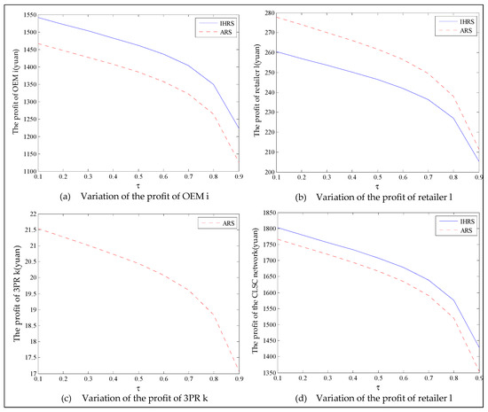 When the lower limit of the recycling rate is high, from Figure 22, the directions of movement for all the decision variables in both models with respect to the proportion of the green consumers in the markets are the same as those for Case 1, which is consistent with the statements of Proposition 5 and Proposition 11. For Case 2 (high lower limit of the recovery rate), from Figure 22, Figure 23 and Figure 24, when the lower limit of the recycling increases, the differences in the production quantity and the sales quantity of the new products between the IHRS model and the ARS model become significant; the profits of the OEMs and the retailers between the IHRS model and the ARS model also become more significant; when the proportion of the green consumers’ efforts increases from to , the patent licensing fee charged to the 3PRs first decreases, and when the proportion of the green consumers’ efforts increases from to , the patent licensing fee charged to the 3PRs sharply increases.