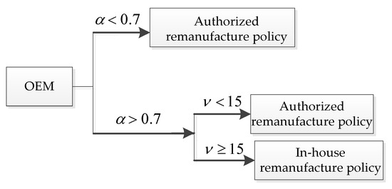 For different lower limits of the recovery rate , the proportion of green consumers has different effects on the OEMs’ choice of remanufacturing decision. In other words, for each , the OEMs will choose the remanufacturing strategies that provide them with better profits. The decision diagram of the OEMs’ remanufacturing strategies based on different values of is shown in Figure 25.