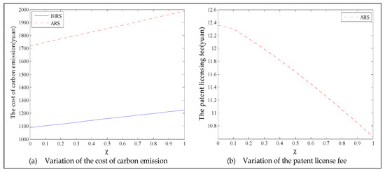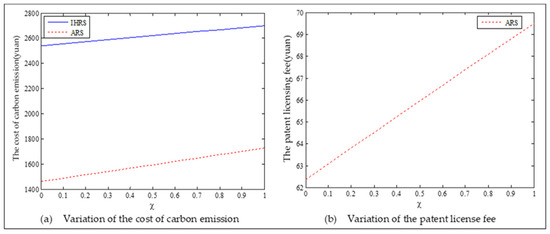 The equilibrium of the decision-makers is shown in Figure 22; the carbon emission costs due to the production of these two products of the IHRS model and the ARS model, and the patent licensing fee are shown in Figure 23; the profit of each decision-maker and the profit of the CLSC network are shown in Figure 24.