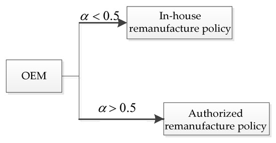 Remanufacturing engineering is designed to repair the used products in such a way that the qualities of the remanufactured products can meet or exceed those of new products. Recent studies have shown that product remanufacturing can increase the demand for remanufactured products, affect the production quantities of new products, and further enable the manufacturer and the whole supply chain to obtain better production methods from the manufacturer recycling model [5,6,7,17]. The main processing method for remanufacturing products is called authorized remanufacturing, in which the original equipment manufacturer (OEM) is only responsible for selling new products; after charging third party remanufacturers (3PR) an authorization fee, the recycling, remanufacturing, and sale of the remanufactured products are authorized to 3PR. Majumder and Groenevelt [18] first analyzed the interaction between 3PR and OEM and discovered that the employment of 3PR has a large impact on the profits of the OEM. Huang and Wang [5] compared different remanufacturing modes and proposed that information sharing can effectively improve the qualities of remanufactured products. Wu and Zhou [6] found that third-party remanufacturing not only increases the income of both the OEM and the remanufacturer but also leads to the improvement of total social welfare. Qiao and Su [7] constructed a two-phase game model to resolve the OEMs’ licensing strategies and the 3PRs’ distribution channel choice issues and found the best royalties for both parties. Zhou and Yuen [19] introduced government subsidies into remanufacturing. Feng et al. [20] studied the trade-in strategy for a CLSC with one manufacturer and two independent remanufacturers. From the above papers, the construction of the production model of authorized remanufacturing not only solves the problems of intellectual property rights and patent licensing but also improves the remanufacturing efficiency and increases the revenue of both the OEMs and 3PRs; consequently, it also leads to the improvement of the overall welfare of society. However, the above-mentioned literature only considers the equilibrium conditions for achieving authorization under different circumstances; it does not consider how the parameters of the model can affect the profits of the decision-makers, the choice of the collection model, and the impact of remanufacturing on environmental pollution. Moreover, there are very few papers considering the model of the OEMs’ in-house remanufacturing, which refers to the situation in which OEMs are responsible for remanufacturing and selling remanufactured products. Therefore, our paper fills the gap in the existing literature by considering two strategies of remanufacturing, namely, the OEMs’ in-house remanufacturing and their authorized remanufacturing. On this basis, the scope of our investigation is expanded to study the strategic choices for the OEM between the two remanufacturing strategies above. We shall analyze the impact of these two remanufacturing strategies on product quantities, prices, profits, and environmental pollution, and shall guide the OEMs on how to improve their production and operation techniques.