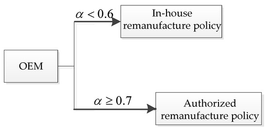 Besides considering the criteria for the manufacturers to choose between remanufacturing strategies, this paper also analyzes the influence of other factors on the remanufacturing strategies, such as carbon emission trading, green innovation, and the green consumer ratio. In recent years, the economy has developed rapidly, and carbon dioxide emissions have also increased. Thus, many countries continue to call for measures to reduce carbon emissions to curb the global greenhouse effect and transform the world economy into a green and sustainable one. Consequently, Aiying and Risto [25] applied the carbon trading system to large-scale industrial activities; Chai et al. [26] studied how carbon allowances and carbon emissions trading can be conducive to remanufacturing, and discovered that in the long run manufacturers should invest in low carbon production technology; Aldieri et al. [27] found that the green innovation subsidy policy can help the enterprises to adopt to the green technology and increase their level of employment; Huang et al. [28] found that the green credit in a supply chain is good for social welfare and environmental benefit. Lee [29] found that the supply chain members’ participation in green innovation activities could achieve a win-win scenario in the CLSC; Xia et al. [30] found that the emergence of carbon trading systems will affect the low-carbon behavior of the OEMs; Yang et al. [31] studied the selection of remanufacturing collection modes under the carbon emission trading system; Li et al. [32] found that the government subsidy strategy could reduce carbon emissions; Lv and Li [33] studied the influence of green consumers on enterprises’ green innovation and found that enterprises would choose to carry out green innovation when green consumers exist in the market; Wang et al. [34] found that stringent regulations do not imply more remanufacturing; Cheng et al. [35] found that manufacturers will increase their green technology investment level under the carbon emission constraint; Sarkar et al. [36] found that green innovation can increase the sale quantity of the product; Xue et al. [37] found that consumers’ low-carbon awareness could increase the profits of supply chain members; Yang et al. [38] did a series of studies on the introduction of carbon emissions trading into remanufacturing. From the above research, it is evident that under the carbon trading system, producers’ production behaviors are constrained in such a way that they will be actively assuming the social responsibility of reducing carbon emissions. The demand for green products from green consumers can prompt companies to make green innovations. Efforts to carry out green production and green innovation efforts can help manufacturing companies improve their competitiveness. Therefore, this paper studies the influence of these green factors on the choice between the two remanufacturing strategies, and the research on carbon emission trading, green innovation, and green consumers in this paper can provide companies with more realistic decision-making plans, which will help them to actively adopt strategy changes, i.e., in-house remanufacturing and authorized remanufacturing, and contribute to the renewal of the companies by finding a greener production method for remanufacturing.
