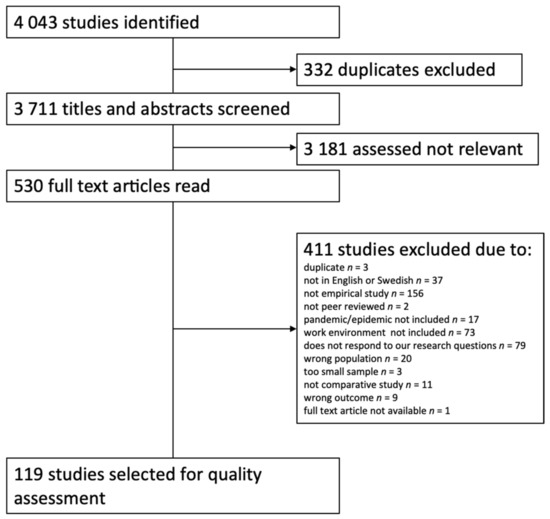 In the literature search 4043 hits were recorded, of which 3711 remained after deduplication. The titles and abstracts of these articles were screened for eligibility and 530 were moved forward for full-text screening. During this step of the process, an additional 411 articles were excluded (primarily because of not being an empirical study) and 119 were passed on to the stage of quality assessment (see Figure 1).