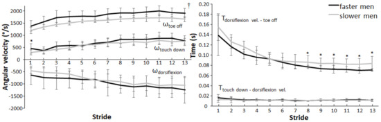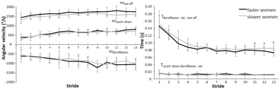 | Time from touchdown to toe off | 0.19 | 0.21 | 0.38 | 0.32 | 0.24 | 0.26 | 0.46 | 0.55 * | 0.64 * | 0.64 * | 0.56 * | 0.62 * | 0.42 | 0.42 | |