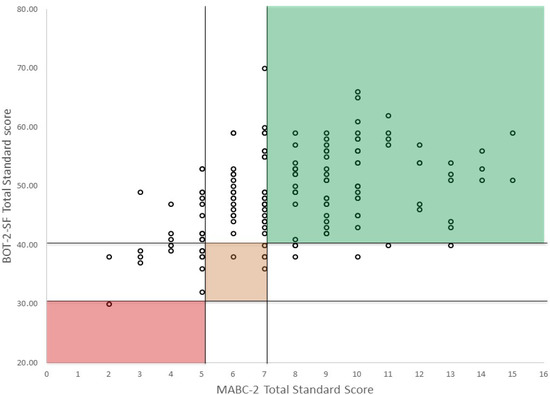 Classification agreement between MABC-2 and BOT-2 (Green: no movement difficulty, Amber: at risk of having movement difficulty; Red: significant movement difficulty). Colored areas show children that had the same classification of the two tests. Please note the children on the left side of the graph (0–5 standard scores on the MABC-2: significant motor difficulty) who score in the normal range (>40) on the BOT-2.