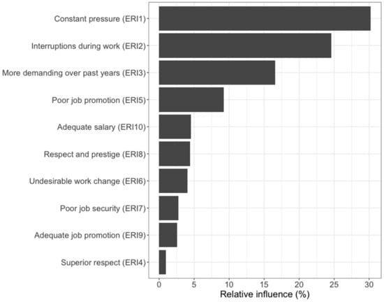The number of times a predictor was chosen over the 500 trees and the amount of error it removed from the model (weighted to the number of predictors) were combined so that each predictor was assigned a relative influence score from 0–100%. A higher relative influence score suggests that a particular predictor is more indicative of an outcome than other predictors. In the context of this study, the effort and reward scale items with the highest relative influence characterize the work stress among this population better than items with lower relative influence. This methodology allowed for novel insights on what factors are contributing the most to work stress across all waste workers sampled, as well as which factors contributed the least.