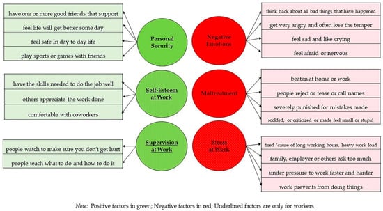 The items cluster around 6 dimensions, closely following the typology established by Martin Woodhead in his seminal paper on child labor and work []. They include: i. self-esteem at work; ii. supervision at work; iii. stress at work; iv. feelings of personal security; v. negative emotions (such as fear and anger); vi. feelings of abuse and mistreatment (Figure 1).