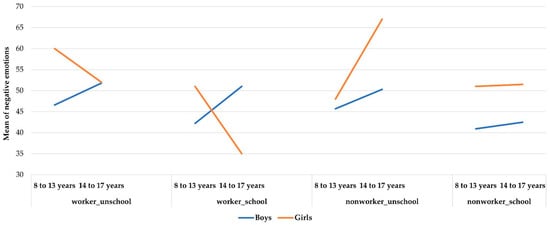 For boys, the worst situation is not going to school, independent of whether they work or not. Boys who did not go to school showed higher levels of negative emotions than those boys who attended school. This effect was even more pronounced in the older age group. The best situation for boys was to not work and to go to school, regardless of age.