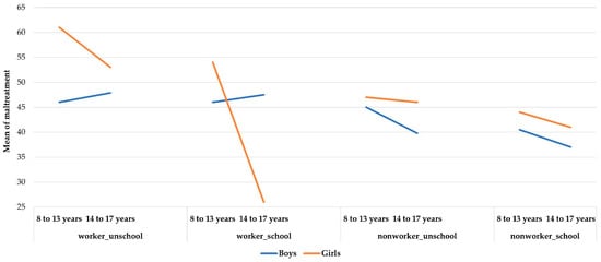 The Maltreatment factor includes items concerned with being beaten or punished, being criticized, and feeling rejected. The model had an explicative value of 13%. The more significant effect on maltreatment was that of Work +/− School (η2 = 0.055), with a smaller effect of Age (η2 = 0.009). This indicated that working children and younger children felt more maltreated than, respectively, the non-working children and the older children. There was a non-significant simple effect of Gender. There were an interaction between Gender and Age (F(3, 935) = 4.96, p = 0.026, η2 = 0.005), between Gender and Work +/− School (F(3, 935) = 2.71, p = 0.044, η2 = 0.009, and a double interaction effect between Gender, Age, and Work +/− School (F(3, 935) = 4.96, p = 0.034, η2 = 0.009.