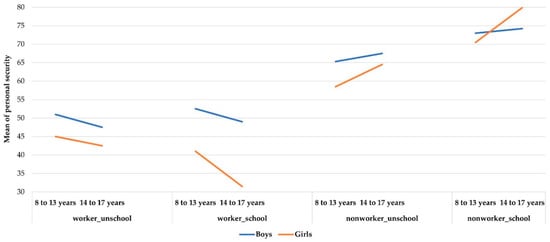 These graphs (Figure 4) show the interaction effect between Work +/− School and Age for boys or for girls on Personal Security. Non-workers had consistently higher scores on this factor than did workers, regardless of gender. There was a difference only among older children between working girls and boys as to attending school or not. Girls who work and attend school, especially those 14–17 years old were more insecure (there was no difference for non-workers, who were parallel). For boys, what was determining was whether they were working or not. For girls, it was the same but attending school was also important.