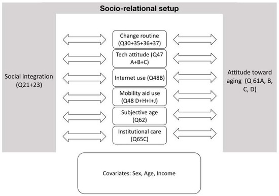 | Change Routines (Q30 + Q35 + Q36 + Q37) | Technology Attitude (Q47) | Mobility Aid Use (Q48D + H + I + J) | Internet Use (Q48B) | Subjective Age (Q62) | Institutional Care Openness (Q65C) | |