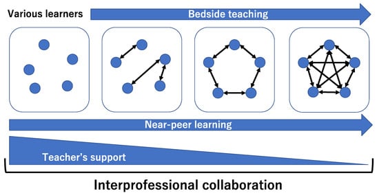 For bedside teaching, near-peer learning is essential. In this research, learning shared among medical students and residents improved their knowledge and skills, leading to effective collaborations. Near-peer learning was used for the education of residents in various specialties [,]. This kind of learning is effective for improving self-directed learning, which can in turn improve knowledge and skills []. In near-peer learning, the involvement of various learners could improve participants’ understanding of different perspectives and help them reflect on their practices [,]. As this study shows, near-peer learning helped participants learn by themselves and realize their growth. Medical teachers also realized that they could use their time more effectively for the education and clinical issues of their patients.