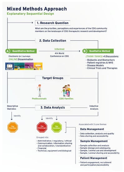 In this study, a community-led, participatory mixed-methods research design was adopted to holistically explore the perceptions and experiences of the CDG community regarding ongoing and future biomedical and clinical research aimed toward therapy development. Members of the CDG community included healthcare professionals (HCPs), researchers, pharmaceutical industry representatives, and families. The main aim of this work was to develop, test, and implement an innovative, inclusive, and reproducible (potentially adaptable to other diseases and biological questions) mixed-methods approach that captures and integrates the research-related needs and perspectives of multiple CDG community stakeholders in order to improve the understanding of the current CDG therapy R&D landscape and guide future research efforts. To effectively achieve this aim, (1) an electronic survey (e-survey) was used to assess the importance attributed by the CDG community to different therapeutic research tools and to establish priorities; and (2) multi-stakeholder think tank discussions were subsequently held to further explore the quantitative findings and to identify challenges and solutions associated with the prioritized therapeutic research tools.
