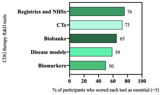 In the e-survey, participants were asked to rate the relevance of several therapy research tools on a scale of 1 (“I don’t think they are important”) to 5 (“I think they are essential”). Prioritized tools were those scored as being essential (scored 5) for CDG therapeutic R&D by most of the participants (≥50%). The analysis of the e-survey results led to the selection of six R&D tools as priorities, namely: patient registries and NHS (76%, 73 out of 96 participants), and CTs (73%, 94 out of 128 participants), biobanks (65%, 44 out of 68 participants), disease models (59%, 75 out of 128 participants), and biomarkers (50%, 32 out of 64 participants) (Figure 2).