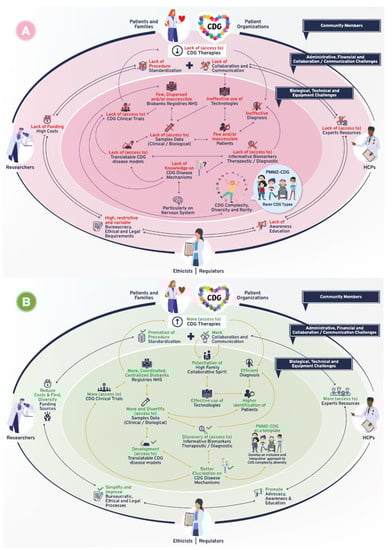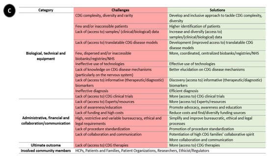 Therapy R&D entails multiple tools and the involvement of various stakeholders with different biological, medical, and technical expertise. However, other factors affect drug discovery and testing including ethical, legislation, and funding issues, some of which are particularly difficult to address in the field of rare diseases [,]. Our study established a unique, replicable community-led research approach that involved both patients’ families and professionals able to collect and integrate the perspectives, priorities, and experiences of all stakeholders regarding therapy-driven biomedical and clinical research. This pioneering approach produced a detailed characterization of the CDG therapy R&D landscape, establishing several points of contact with other rare disease communities. It also unveiled that CDG therapy R&D success sits on six prioritized research tools, which is limited by several challenges that constrain the appropriate management of data, samples, and patients. The CDG community proposed various solutions that can be deployed to address those challenges, promote people-centric therapy R&D, and inspire other rare disease communities to devise actions to tackle similar therapy research-related problems.