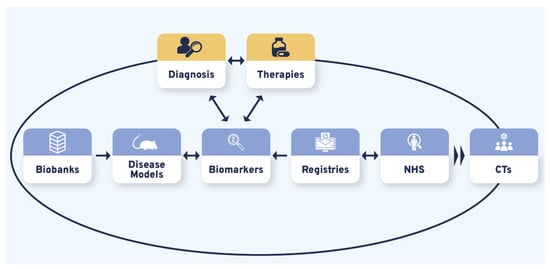 Therapy research and development (R&D) encompasses several stepwise phases, from early drug discovery to post-market authorization and monitoring. Multiple tools and studies are integrated with these phases, ranging from drug/compound to biological material and clinical data repositories, disease models, and biomarkers. In addition, natural history studies (NHS) also play a critical role in therapy development. Overall, therapy R&D entails the identification of promising molecules and understanding of the pathophysiological mechanisms responsible for clinical phenotypes and disease evolution, culminating in controlled human testing in clinical trials (CTs).