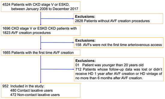 Hoang Anh, T.; Nguyen, P.-A.; Duong, A.; Chiu, I.-J.; Chou, C.-L.; Ko, Y.-C.; Chang, T.-H.; Huang, C.-W.; Wu, M.-S.; Liao, C.-T.; et al. Contact Laxative Use and the Risk of Arteriovenous Fistula Maturation Failure in Patients Undergoing Hemodialysis: A Multi-Center Cohort Study. Int. J. Environ. Res. Public Health 2022, 19, 6842. https://doi.org/10.3390/ijerph19116842