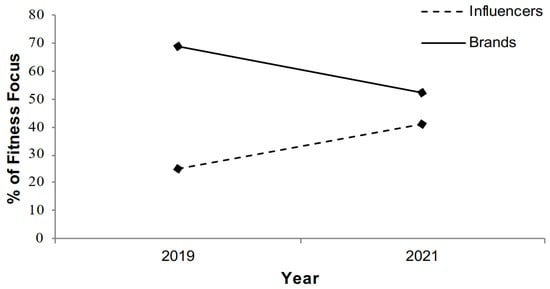 Although fitness focus remained higher in brand content, fitness influencers did increase the amount of fitness-focused content shared between 2019 and 2021. As influencers are more dependent on the engagement of their followers [55], they might have been under more pressure to diversify their content to reflect the changing demands of their followers. As such, this finding aligns with Godefroy’s [29] initial observation that in response to COVID-19, fitness influencers changed their content to increasingly adopt the role of sports coaches. Brands, on the other hand, already shared more fitness-focused content before the pandemic and thus might not have had to adapt their content in the same way. Future research should monitor how this trend develops in the coming years.