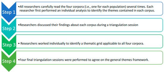 A thematic analysis [29] was performed on the whole corpus using the computer-assisted qualitative data analysis software Nvivo (Melbourne, Australia) by three researchers: two sociologists (LC, NMB) and a public health researcher (MC). As described in Figure 1, the coding process was first performed independently by all three reviewers. Researchers then discussed their coding and the themes and subthemes they identified in each corpus during a triangulation session.