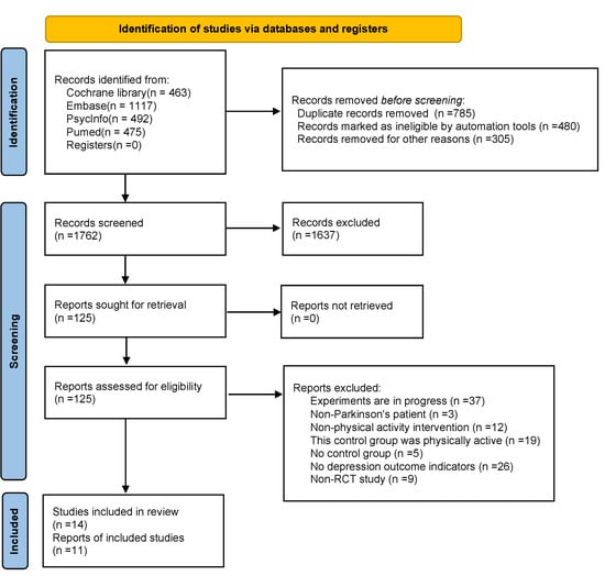 The flow chart of the literature search for the selection process is shown in Figure 1. A total of 2547 articles were found by computer search and manual search, and after screening out duplicate records, 1762 articles remained. Then manual search for titles and abstracts was conducted, 1637 articles were screened out, the remaining 125 articles were screened in full text, and 111 articles were excluded after full-text screening, of which 37 studies were not yet completed; 3 studies had patients that included healthy older adults; 12 studies did not have physical-activity-only interventions; 24 studies did not have a control group, or the control group was physically active; 26 studies did not have depression outcome indicators; and 9 studies were non-RCT types. The final 14 papers agreed by both researchers were included, of which 3 papers [,,] had depression outcome indicators for which data could not be extracted, and only qualitative analysis was performed. The remaining 11 papers [,,,,,,,,,,] were subjected to meta-analysis.