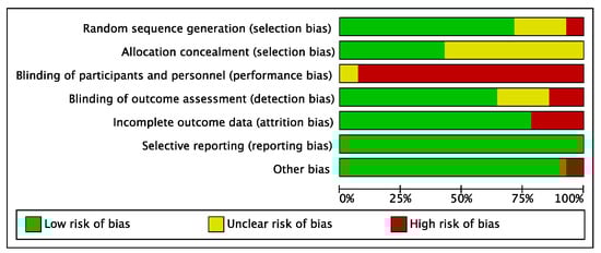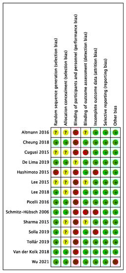 The risk of bias assessed for the 14 included studies is shown in Figure 2 and Figure 3. Ten studies [,,,,,,,,,] described the generation of a completely randomized sequence, and 6 studies [,,,,,] used a suitable allocation concealment method. Thirteen studies [,,,,,,,,,,,,] described that participants signed an informed consent for the experiment so that participants were nonblinded, which is a common drawback of nondrug clinical trials. There were 9 studies [,,,,,,,,] that were blinded to outcome evaluators. Regarding the completeness of outcome data, participants were missing from 3 studies, with an unbalanced number and reasons for missing between groups [,,]. One study was evaluated for other bias due to the presence of an imbalance between the experimental and control groups at baseline [].