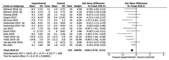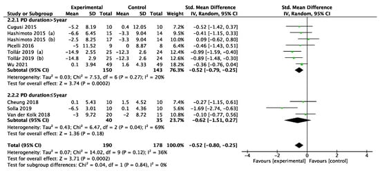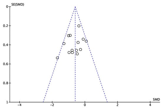 Meta-analysis was performed using the Review Manager 5.3 software provided by the Cochrane Collaboration, and statistical significance was defined as a p-value < 0.05 (all reported p-values are two-sided). The outcome in this study was a continuous variable. Standardized mean differences (SMDs) were calculated as effect sizes for the statistics, and 95% confidence intervals (CIs) were calculated by effect analysis. According to the interpretation of Cohen (1988), SMD < 0.2 is a small effect size, 0.2 ≤ SMD < 0.5 is a small effect size, 0.5 ≤ SMD < 0.8 is a medium effect size, and SMD ≥ 0.8 is a large effect size []. The heterogeneity of the study was expressed by I2, and the low-, medium-, and high-degree heterogeneities were denoted by the I2 statistics of 25%, 50%, and 75%, respectively []. A fixed-effects model was used for I2 < 50% and p ≥ 0.1. A random-effects model was used for I2 ≥ 50% and p < 0.1. A subgroup analysis by disease duration, intervention type, intervention period, intervention frequency, and intervention time was performed. Meta-regression was performed using the Stata SE 16.0 software (StataCorp, College Station, TX, USA) to explore potential sources of heterogeneity between studies. Funnel plots were used to test for the presence of publication bias. Sensitivity analysis was performed to determine the stability and reliability of the results.