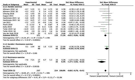 In the 11 studies included in the meta-analysis, a total of five depression scales (BDI, HADS, GDS, HAMD, SDS) were used to measure the effect of physical activity on depression in PD patients. Because the studies took different scales for evaluation, standardized mean difference (SMD) was used as the effect statistic for the analysis. As shown in Figure 4, the fixed effects model revealed a moderate and significant improvement in depression in PD patients who performed physical activity compared with controls (SMD = −0.60; 95% CI = −0.79 to −0.41; p < 0.00001). The heterogeneity statistic I2 = 30% indicated potential moderate heterogeneity.
