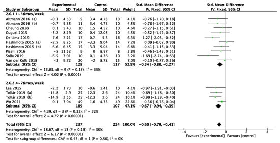 Subgroup analysis of intervention frequency [,,,,,,,,,,].