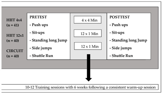 The study initially started with a pretest on aerobic endurance performance and strength capacity. After the pretests, six participating classes were randomly assigned into one of the three training groups (the P.E. teachers drew lots). During the following six weeks, the students carried out the allocated training protocols (10–12 sessions) twice a week during their regular P.E. lessons. The study was terminated with a posttest including the exact same test parameters as the pretest.