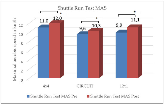 The training group HIIT (4 × 4) reached a performance increase in maximal aerobic speed (MAS) of 9.1%, the HIIT (CIRCUIT) group of 9.4% and the HIIT (12 × 1) of 12.1%. The increase in aerobic capacity through the training intervention was statistically significant for all three groups: