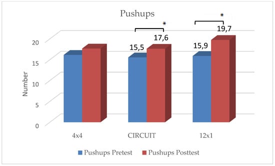 Changes in number of pushups within intervention groups. * Significant difference between pre- and posttest (p < 0.05).