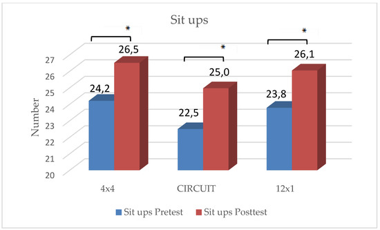 Changes in number of sit-ups within intervention groups. * Significant difference between pre- and posttest (p < 0.05).