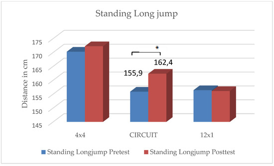 Changes in distance covered with standing long jump within intervention groups. * Significant difference between pre- and posttest (p < 0.05).