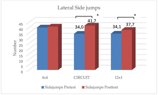 Changes in lateral side jumps within intervention groups. * Significant difference between pre- and posttest (p < 0.05).