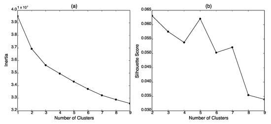 The photos in the research sample were clustered through k-means algorithm [49]. First, each photo was transformed into a vector using the img2vec-keras library (https://github.com/jaredwinick/img2vec-keras; accessed on 29 September 2021). A photo was infused into the ResNet50 model [50] which was trained on the ImageNet [51] dataset, and the penultimate layer of the model was used as the vector of the photo with 2048 dimensions. Next, the optimal number of clusters was determined using the elbow method and the silhouette score method [52]. Figure 1 indicates that the elbow (a) and the highest silhouette score (b) were observed at the optimal number two. The photos were grouped into two clusters on the basis of this result: 8084 photos were placed in cluster 1 and 24,020 photos were allocated to cluster 2.