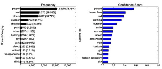 To determine (2), content tags and accompanying confidence scores were attached to each photo by the pretrained AI. A single class was assigned to a photo in (1), but multiple tags describing its content could be attached to a photo, and each tag was accorded a confidence score demonstrating the degree of correspondence between the tag and the photo content. The higher the confidence score of a tag, the more the content of a given photo pertained to the tag. For example, the content of a photo could be described as a set of tags with confidence scores: text (0.9999137), grass (0.999893069), outdoor (0.9880197), bicycle (0.9697462), sign (0.8423048), and land vehicle (0.6875147). The confidence scores of each tag were respectively averaged for all photos to evince the overall content of the photo corpus.