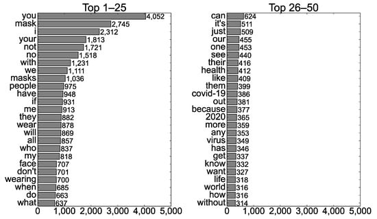 The words presented in the photos with a #NoMask hashtag were examined for RQ1(c), and Figure 3 displays the 50 most frequent words. Naturally, mask-related words such as “mask (s),” “face,” and “wear (ing)” appeared frequently. The context of a #NoMask hashtag was mentioned through words such as “COVID-19,” “virus,” and “2020.” #NoMask seemed to be utilized in terms of public health with words such as “health” and “life.” The high frequencies of negative words such as “not,” “no,” and “don’t” suggest that the negative aspects of wearing masks would primarily be asserted.