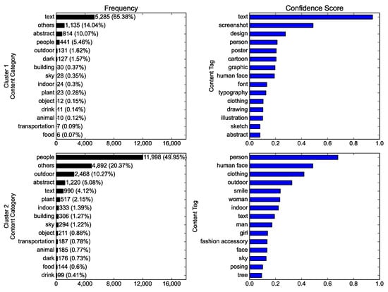 Two clusters were compared in terms of the content. Figure 4 shows the clear distinction between clusters: text-centered and people-centered. Cluster 1 yielded “text” as the content category with the highest frequency, and text-related tags such as “text,” “screenshot,” “design,” “font,” and “typography” exhibited high mean confidence scores. Contrastingly, photos assigned to the people category took the largest share of cluster 2, and people-related tags such as “person,” “human face,” “clothing,” “smile,” “woman,” “man,” and “girl” evinced high mean confidence scores.