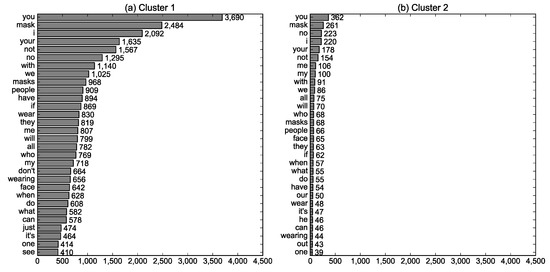 The words presented in the photos classified into two clusters were compared, and Figure 5 presents the 30 most frequent words appearing in each cluster. Cluster 1 was text-centered and thus included more words: the mean number of words was calculated as 5.519 in cluster 1 and 0.398 in cluster 2 (t = 137.319, p = 0.000). Some words were peculiar to cluster 1 (“don’t,” “just,” and “see”) or cluster 2 (“our,” “he,” and “out”); however, obvious differences were not observed between clusters in presented words.