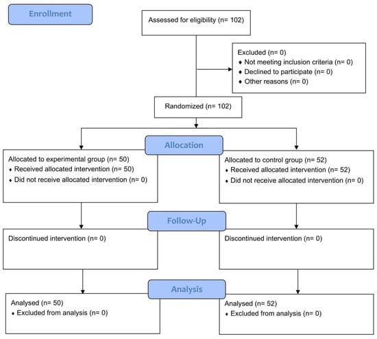 This study was approved by the Research Committee Board of Jen-Ai Hospital (Confirmation Number: 107-47), which is guided by local policy, national laws, and the World Medical Association Declaration of Helsinki. This study strictly followed the Consolidated Standards of Reporting Trials (CONSORT) statement for randomized controlled trial, as shown in Table A1. There were no changes to the methods or trial outcomes after trial commencement. Informed consent forms were obtained from all participants prior to their participation in data collection. To avoid bias, no interim analyzes were performed. Since the experimental interventions presented minimal risks, no data monitoring committee would be established, nor would a stopping procedure be implemented. No harm was expected with respect to either treatment.