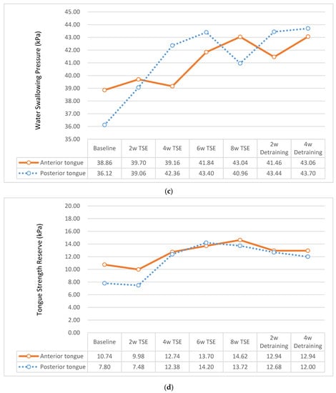 The present study explored the changes in the MIP, saliva and water swallowing pressures, and tongue strength reserve for both anterior tongue and posterior tongue among healthy adults with regards to 8-week TSE training and then 4-week detraining.