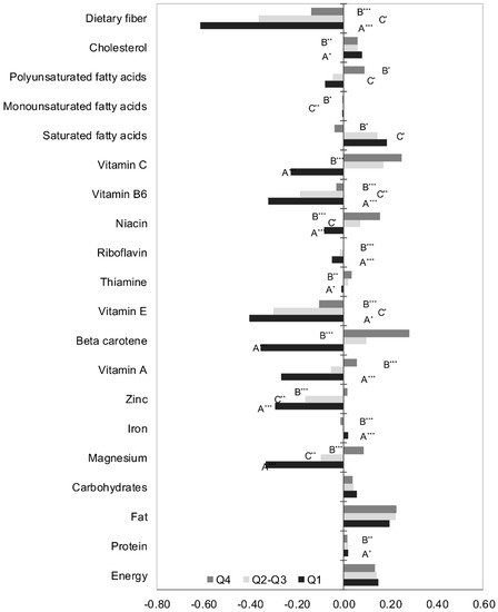 The overall inflammatory effect of energy, macro and micronutrients (mean value). A—significant differences between Q1 vs. Q2–Q3; B—significant differences between Q1 vs. Q4; C—significant differences between Q2–Q3 vs. Q4; * p < 0.05; ** p < 0.01; *** p < 0.001.