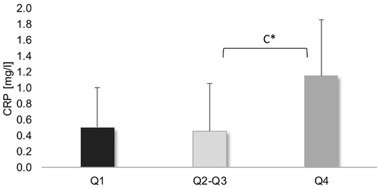 Protein C reactive (hs-CRP) concentration in men with different DII (median ± quartile).; C—significant differences between Q2–Q3–Q4; *—p < 0.05.