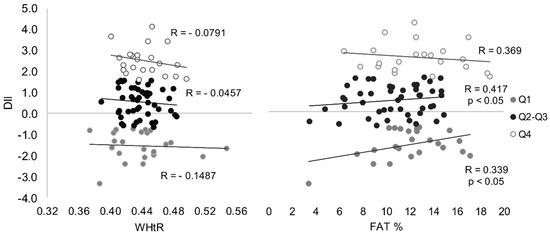 Correlation between DII and WHtR (left) and FAT (right) content in men with different DII.